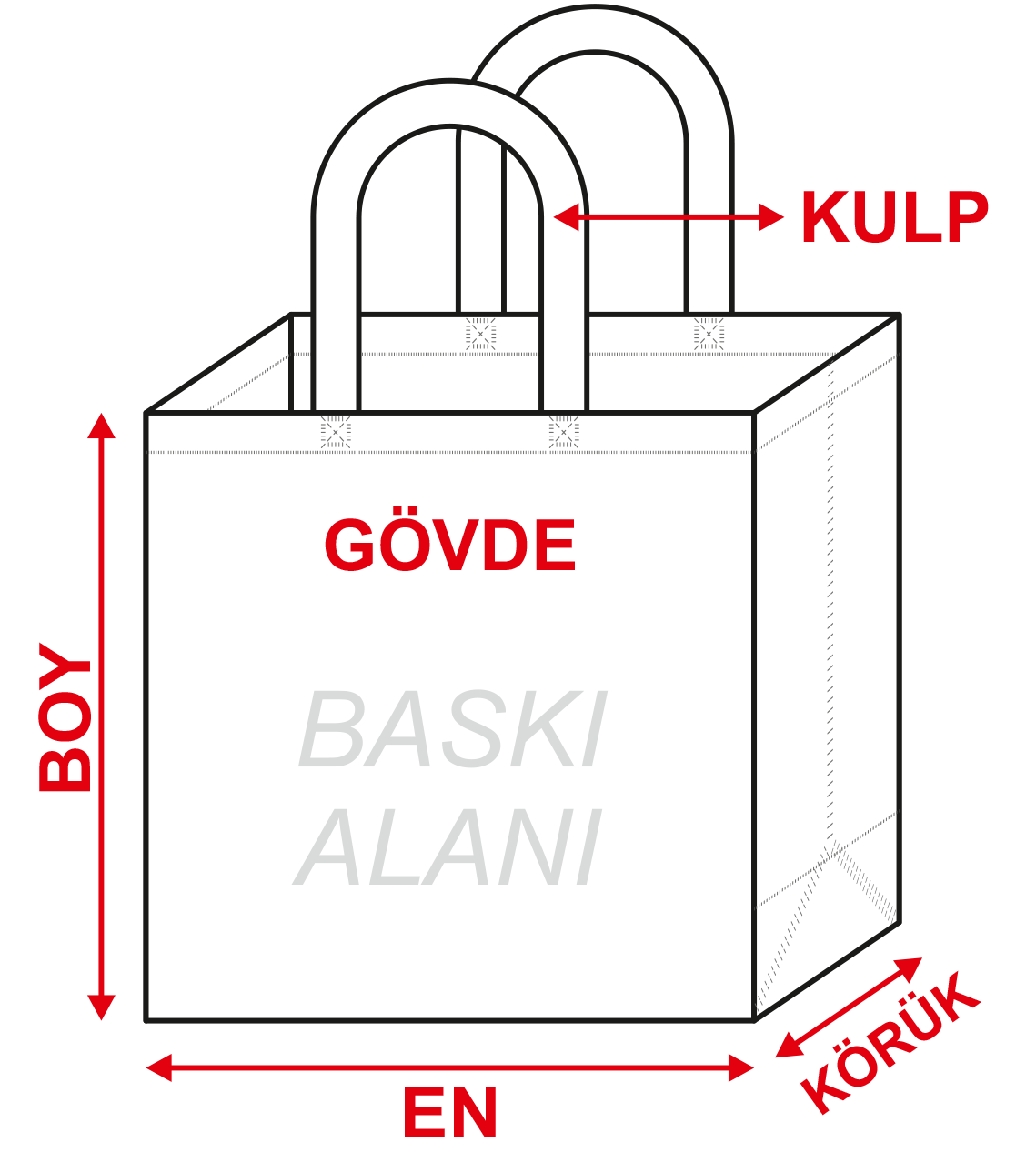 Baskı Alanı: Çantanın gövdesine, körüklerine veya her ikisine de baskının yapıldığı alandır. Baskı alanı baskının türüne, çantanın şekline veya yapılacak baskının maliyetine göre küçültülüp büyütülebilir. Baskı tekniği veya şekli malzeme türüne ve istenen görselin içeriğine göre değişmektedir. Genelde malzemeye baskı için Ofset, Serigraf, Flexo, Transfer ve Süblimasyon tekniği kullanılmaktadır.