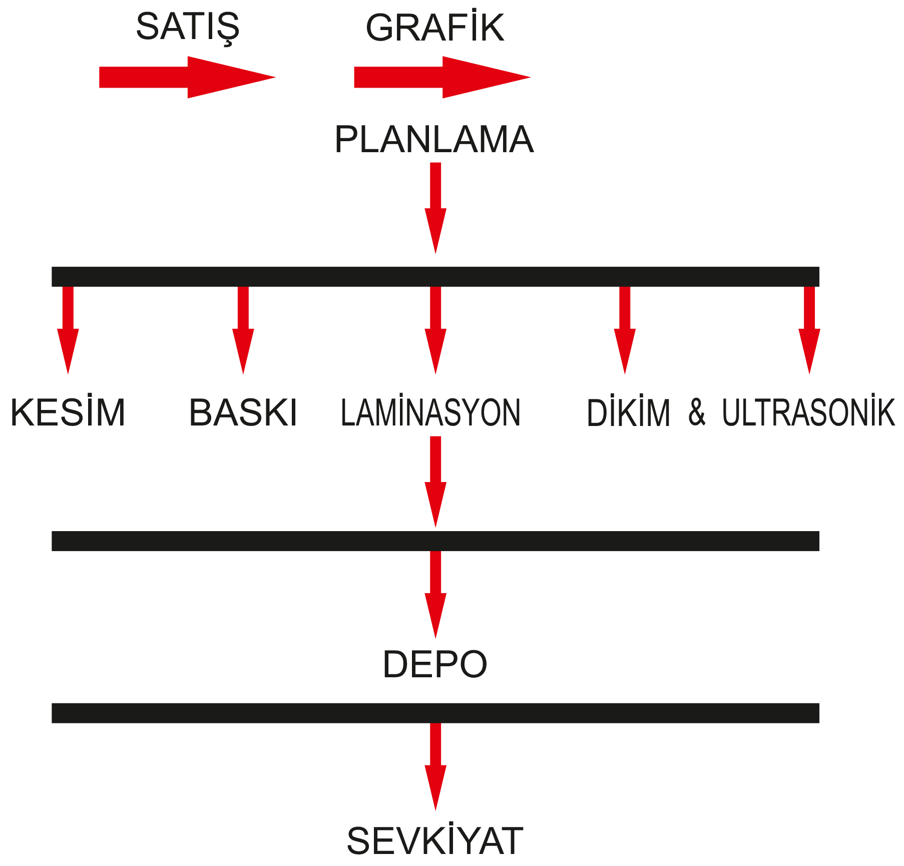 Üretim: Üretim sıralaması işe göre değişebilir fakat genel sıralaması laminasyon, kesim, baskı ve birleştirme istasyonlarıdır. Biten işler, satışçı aracılığıyla müşteriye iletilir ve sevk edilmek üzere depoya alınır.